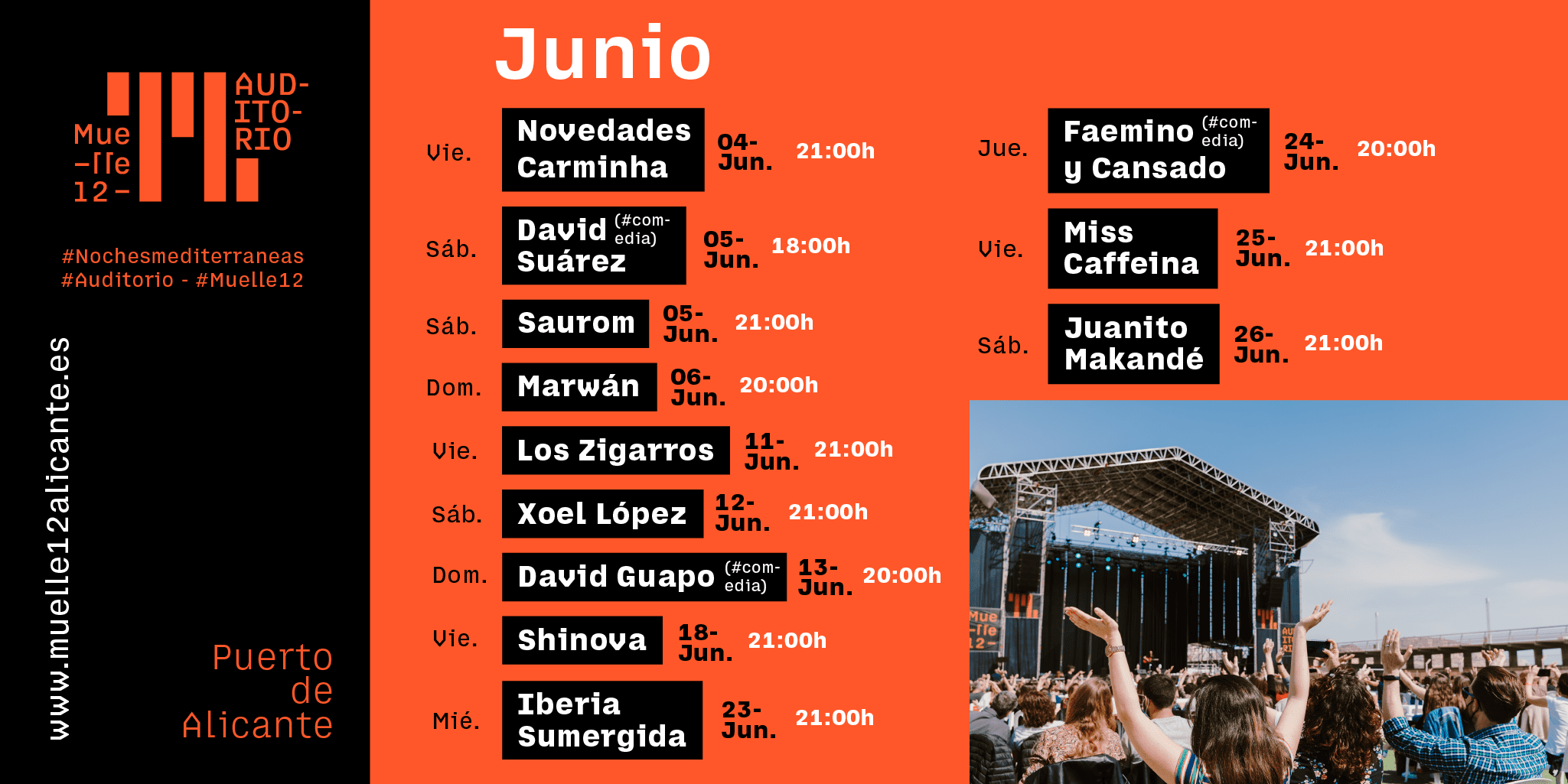 El mes de junio viene cargado con más conciertos en la ciudad de Alicante, con el impulso de Vibra Mahou y su escenario en Muelle12, por donde pasarán este mes artistas como Miss Caffeina, Xoel Lopez, Shinova, Novedades Carminha o Los Zigarros.
